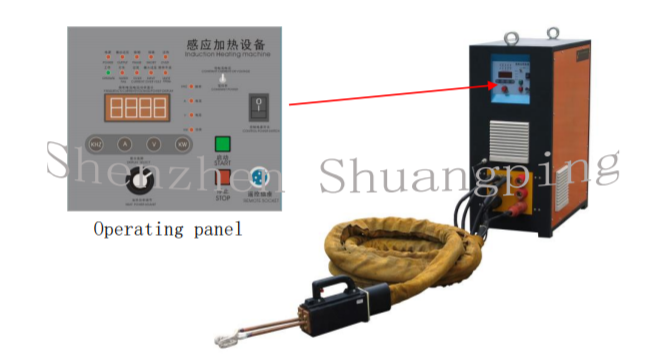 Representing SPYD heater with frequency 20KHZ around and 10KW power. Operating panel is as shown in below picture. Additional cooler or water circulating system should be prepared to cool SPYD machine and coil.